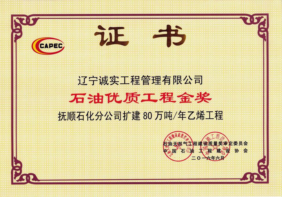 2016年石油優質工程金獎(撫順石化分公司擴建80萬噸/年乙烯工程)
