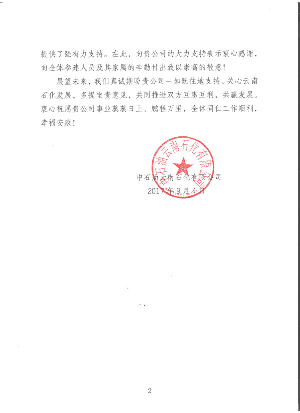我公司于今日收到由中國石油云南石化有限公司發給我方的《感謝信》一封,信中提到:對于我方所監理服務的煉油項目自2006年啟動籌備工作至今,我方監理人員不計利益得失,勇于承受壓力,使得該項目近日順利投產試車成功。對于我單位的工作給予極大的肯定以及衷心的感謝。對方還提到:希望雙方在日后的共同發展中,互惠互利,共贏發展。