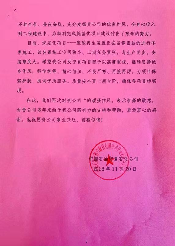 2018年11月20日,我公司收到了一封來自業主——中國石油天然氣股份有限公司寧夏石化分公司的感謝信。
