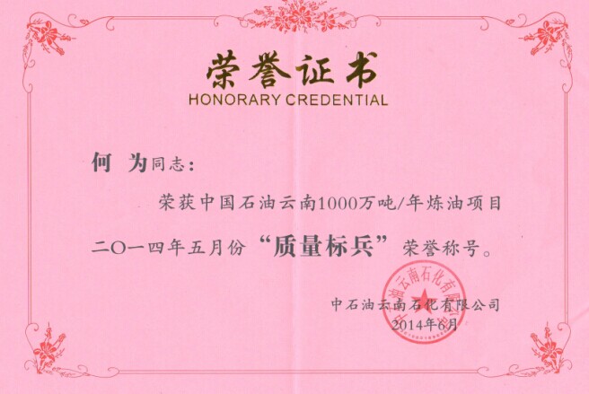 云南項目部何為同志榮獲中國石油云南1000萬噸/年煉油項目2014年5月份“質量標兵“榮譽稱號