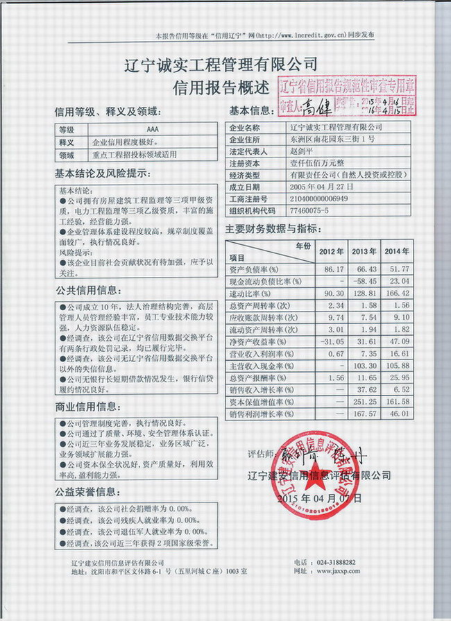 2015年4月,經遼寧建安信用信息評估有限公司信用評級委員會的評定,我公司被確定為最高信用等級“AAA”級。